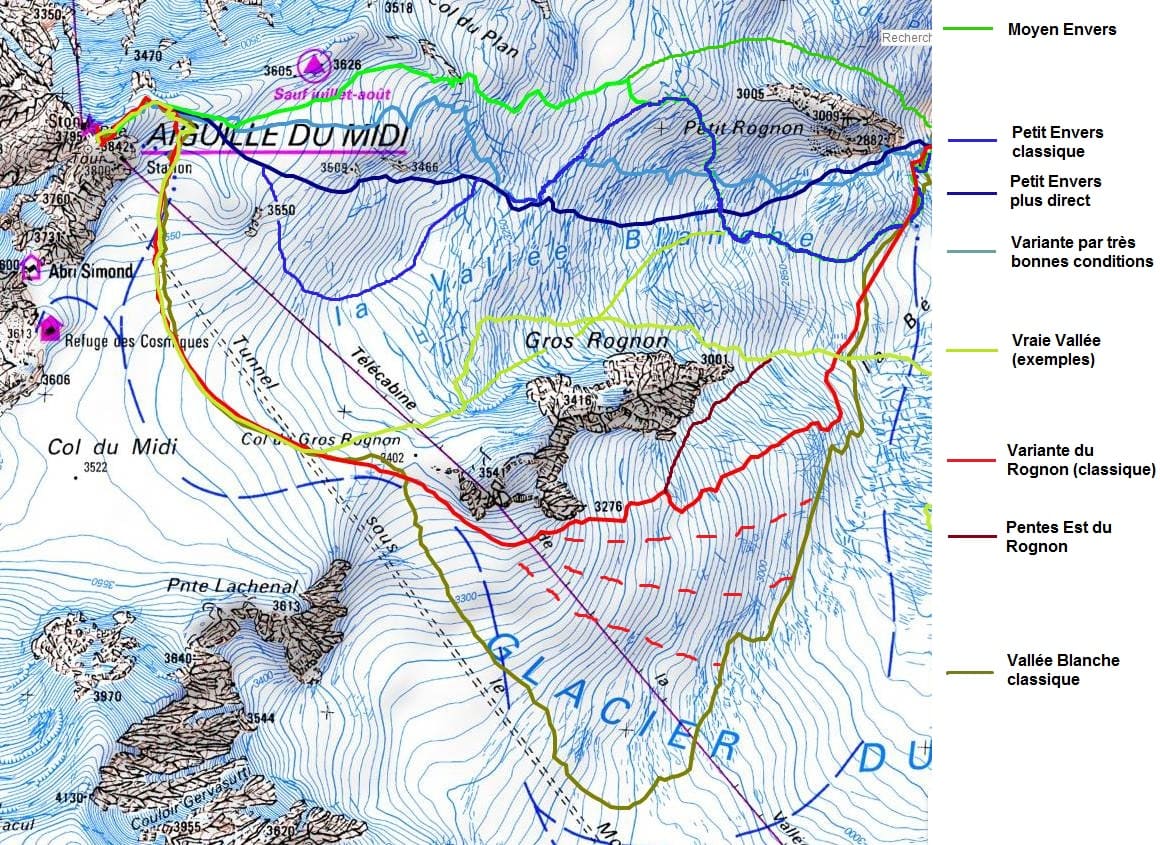 On parle de Vallée Blanche, en fait 6 grands itinéraires sont accessibles depuis l'aiguille du Midi. On skie sur le glacier du Géant, le glacier de la Vallée Blanche et le glacier d'Envers du Plan. Tous ces itinéraires se rejoignent au niveau du glacier du Tacul et sont communs sur la Mer de Glace jusqu'à Chamonix. De nombreuses variantes sont possibles suivant les conditions, mais il faut savoir que plus on s'éloigne des classiques et plus on évolue dans un environnement glaciaire tourmenté et crevassé. Les guides relient souvent certains itinéraires suivant les conditions de neige et les skieurs du groupe.