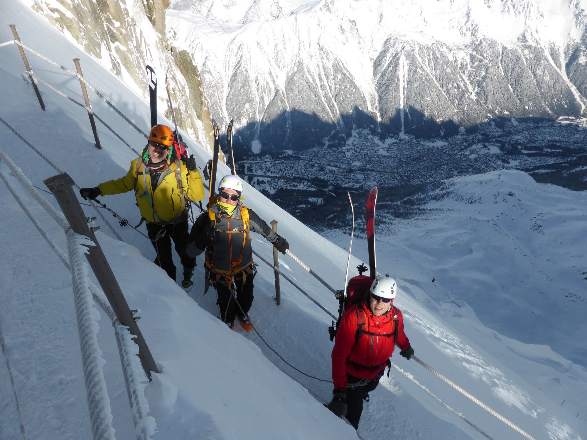 Une ou 2 cordes fixes sont en place généralement de mi janvier à mi avril. En pleine saison de mi-février à fin mars, un passage est taillé en face Nord, on l'appelle le Z. C'est une sorte de trottoir d'un mètre de large incliné à 15° et encadré de cordes fixes. Quelque soit le passage emprunté, le sol est souvent glacé et très glissant. L'usage actuel est que chacun fixe ses skis sur le sac à dos pour pouvoir tenir les cordes fixes avec 2 mains, et les guides utilisent systématiquement des crampons pour eux et leurs clients. Hors saison (décembre, janvier, mai), l'usage du matériel complet d'alpinisme est de rigueur.