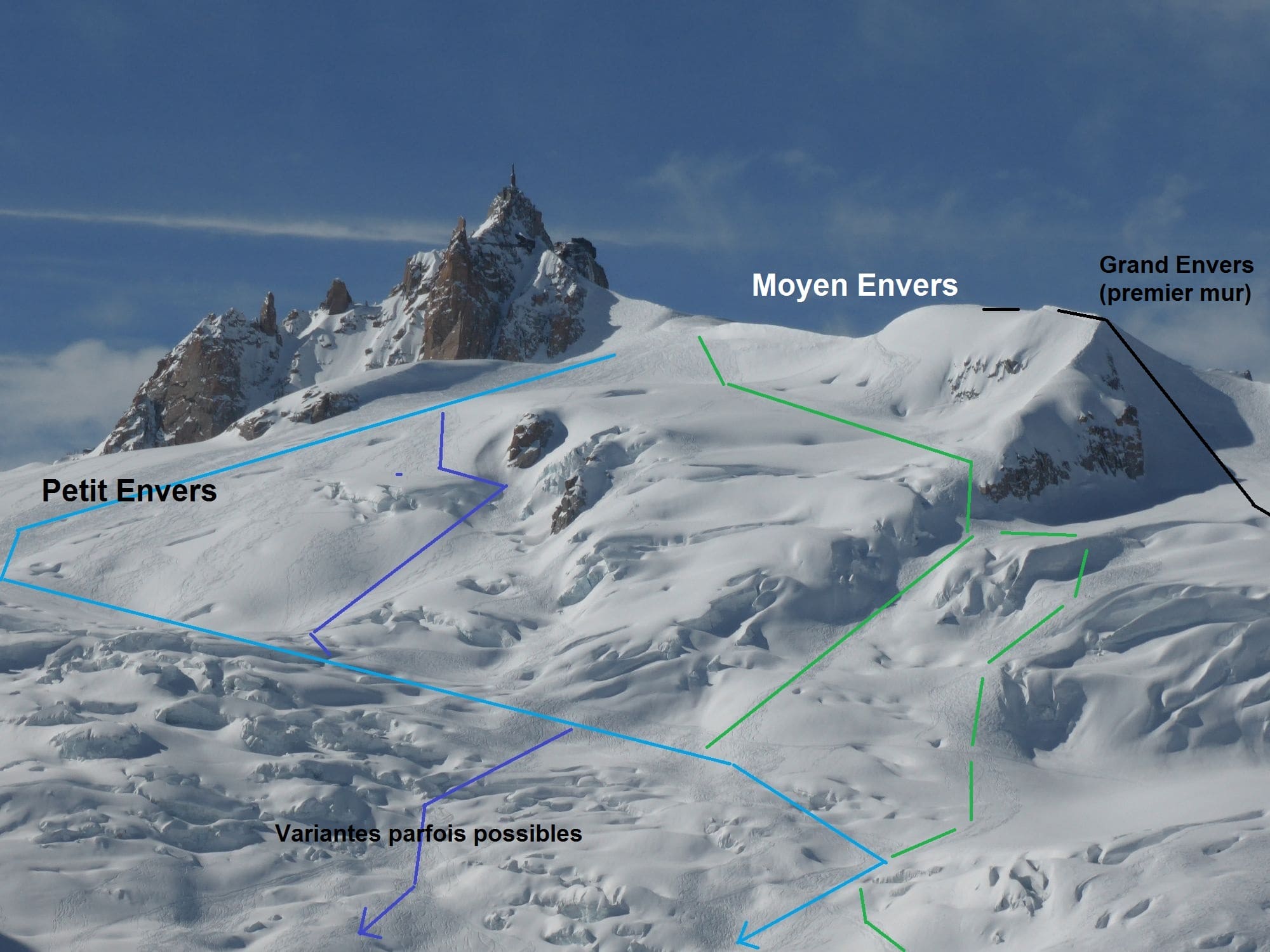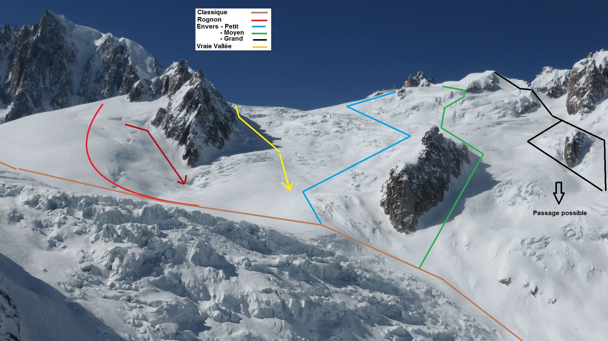 Autre itinéraire classique, c'est le plus facile des passages s'insérant au coeur des glaciers Vallée Blanche / Envers du Plan. Très crevassé, il demande un bon enneigement et de l'expérience. Le passage le plus simple n'est pas très raide, et globalement à l'abri des avalanches. Plusieurs variantes sont possibles et permettent de tracer parfois un bel itinéraire, assez direct entre Aiguille du Midi et Salle à Manger.Moyen Envers du Plan