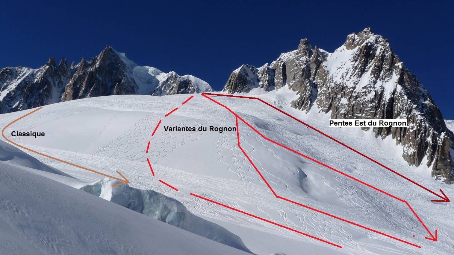 Il s'agit actuellement de l'itinéraire le plus parcouru de tous. Il est devenu plus classique que la Vallée Blanche dite "classique", car les pentes sont plus intéressantes à skier et on évite les traversées de la Classique sans perdre le panorama !Au col du Gros Rognon, on longe à gauche pour contourner le Gros Rognon par le versant sud. Les pentes sont de plus en plus raides en se décalant vers la gauche, jusqu'aux pentes soutenues de la Combe Est.